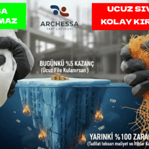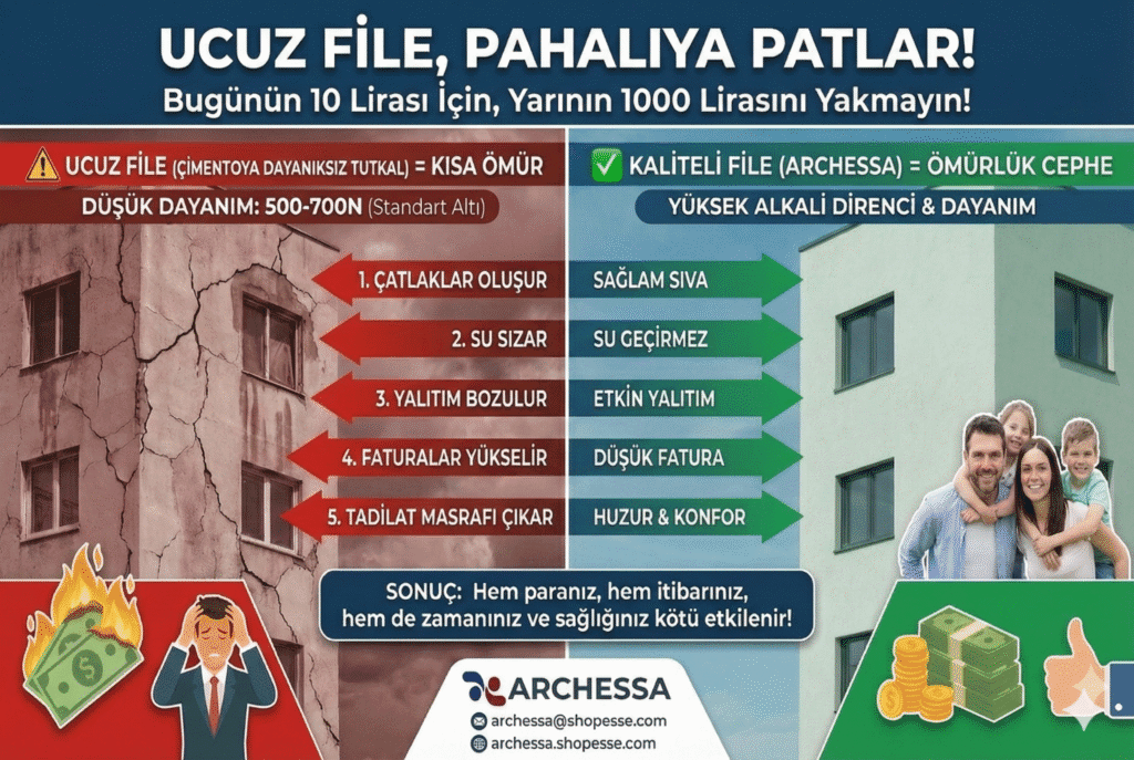 Yapıların estetiğini ve dayanıklılığını tehdit eden en büyük risk, sıva altındaki kalitesiz filelerdir. ARCHESSA Premium Sıva Filesi, sıradan C-Sınıfı filelerin aksine, sadece bugün değil onlarca yıl boyunca cephenizin çatlaklara ve dış etkenlere karşı kusursuz kalmasını garanti eder. ARCHESSA, mimari estetiğe eklediğimiz dayanıklı temeldir.